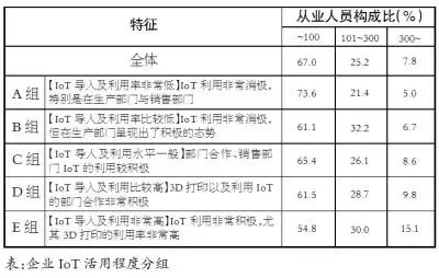 为调查日本智能工厂发展现状(IoT利用现状),日本经济产业省分别对3858家企业进行了调查,并将全体企业分为A、B、C、D、E五组(如下表),从A组到E组的IoT利用率依次提高,企业规模分为300人以上、101~300人、100人以下三个等级。横向看,无论哪个组中,100人以下、101~300人的中小企业占比均较高,原因在于中小企业数量较多,而300人以上企业的数量较少,仅占全体企业的7.8%;从纵向来看,300人以上企业IoT利用率从A组的5.0%依次提高,在E组中的占比为15.1%,而100人以下企业的占比则呈现了依次下降的情况,101~300人企业在各组中的占比均比较稳定。由此可见,企业IoT利用以大企业为主,中小企业引入态度积极。