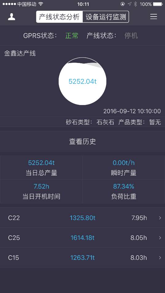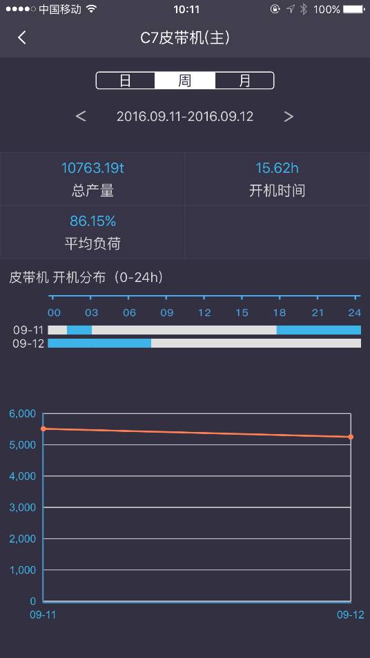 2. 可按日周月查询各皮带机的历史数据,包括每天的开机时间分布图、每天的产量图,累计产量、累计开机时间、平均负荷等。